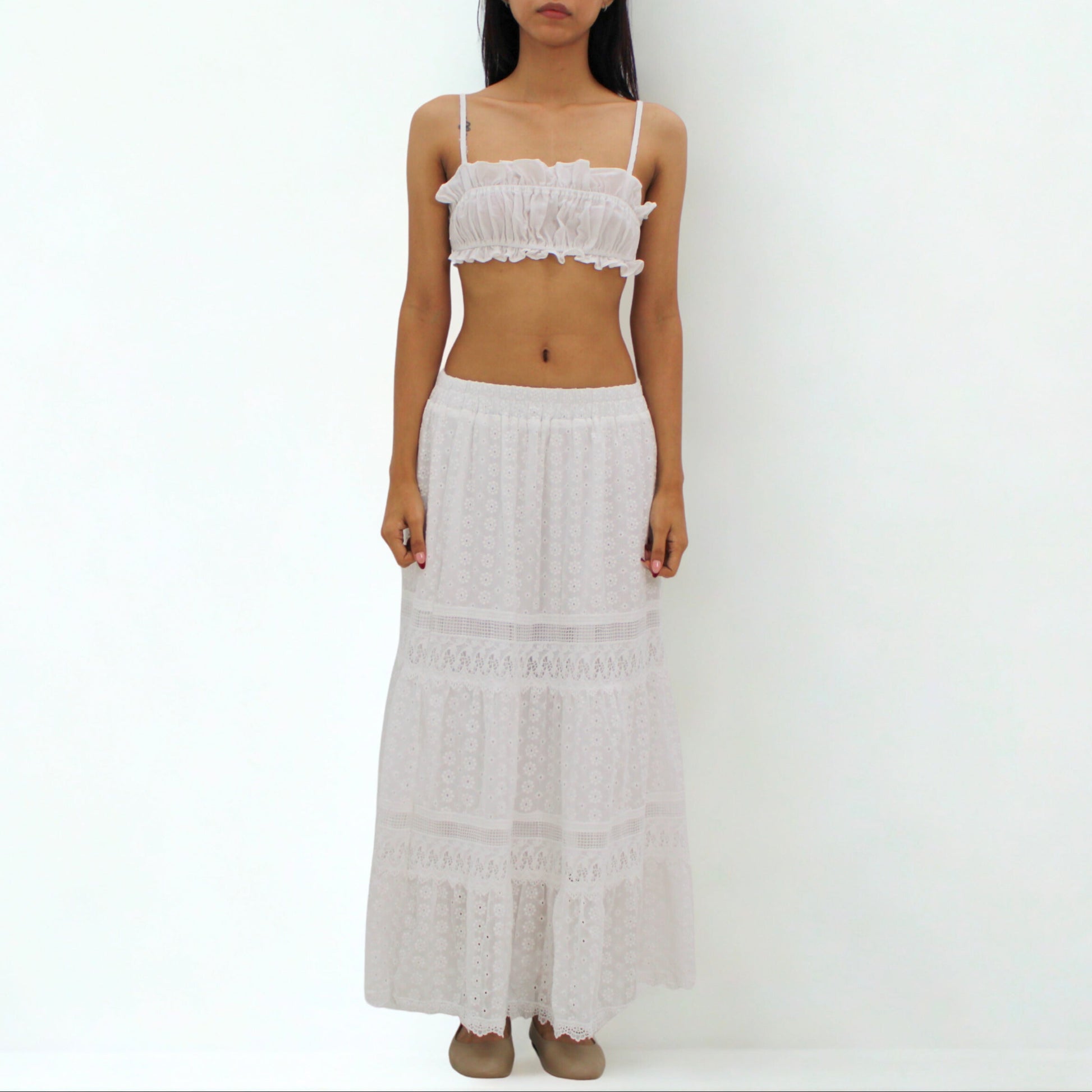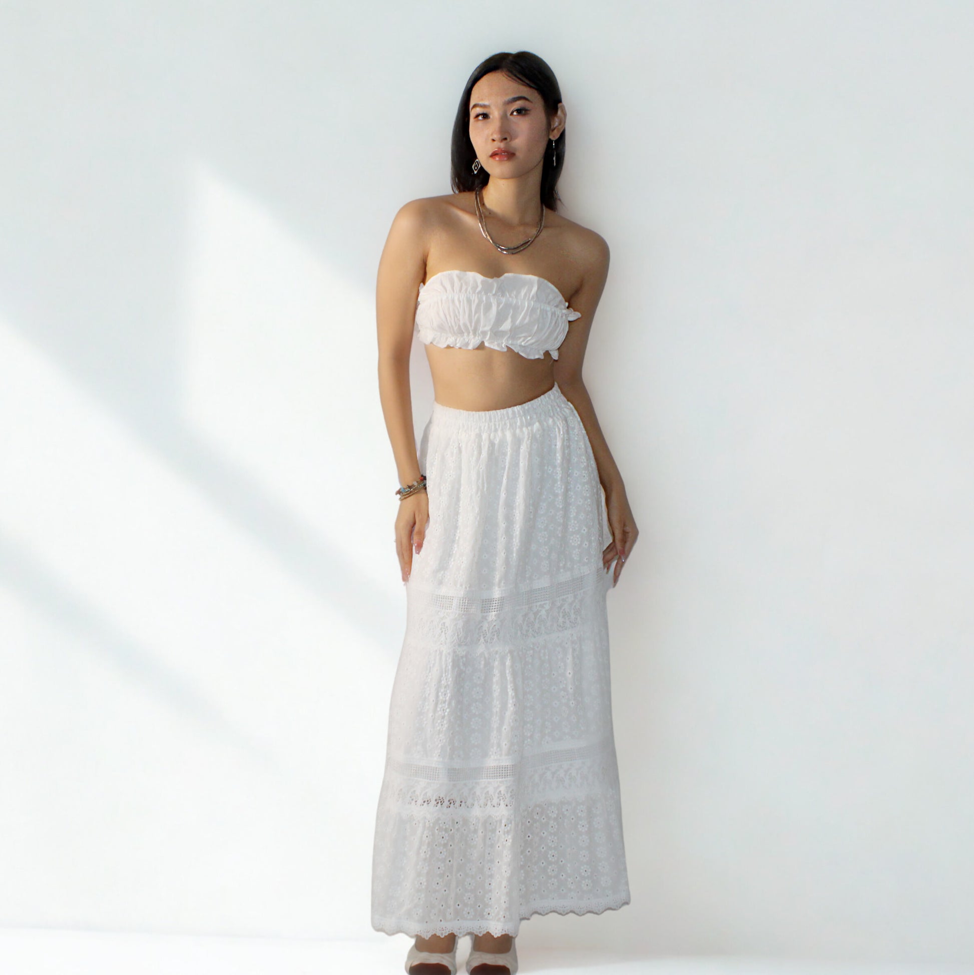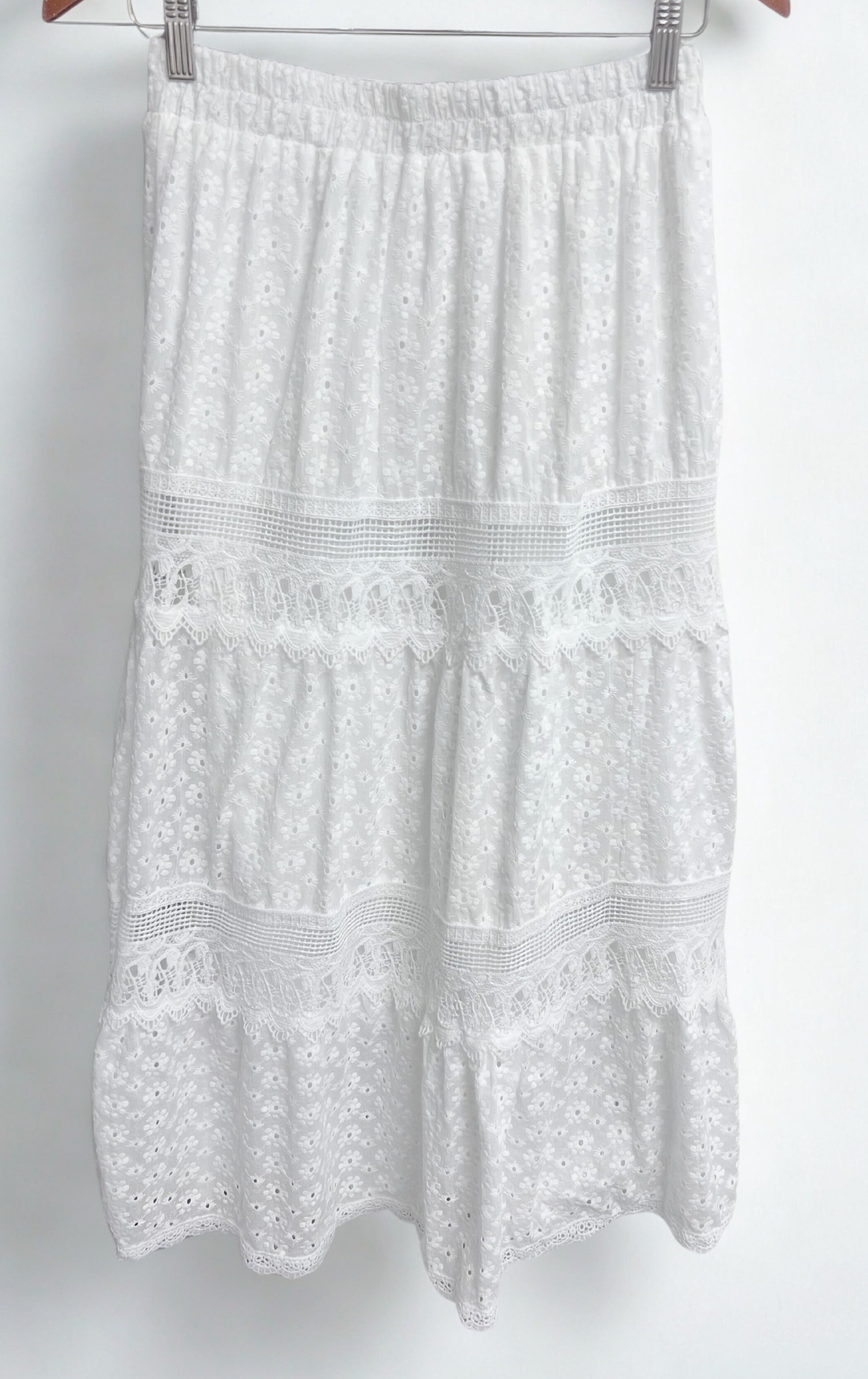 Embrace effortless charm with the Elira Cotton Eyelet Skirt. Made from 100% breathable cotton, this black midi skirt features delicate eyelet embroidery and a graceful lace trim hem. The romantic silhouette is perfect for summer outings, brunch dates, or slow walks through the city.