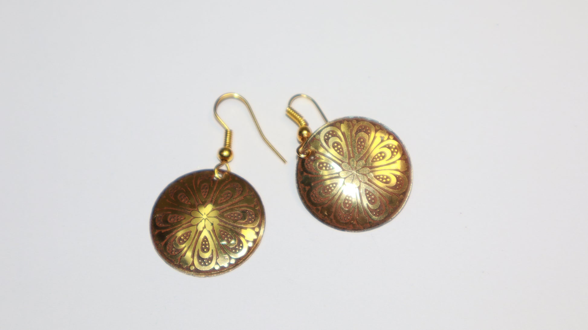 These lightweight brass earrings feature a detailed lotus flower engraving. Fully handmade and perfect for bohemian, ethnic, or artistic looks.