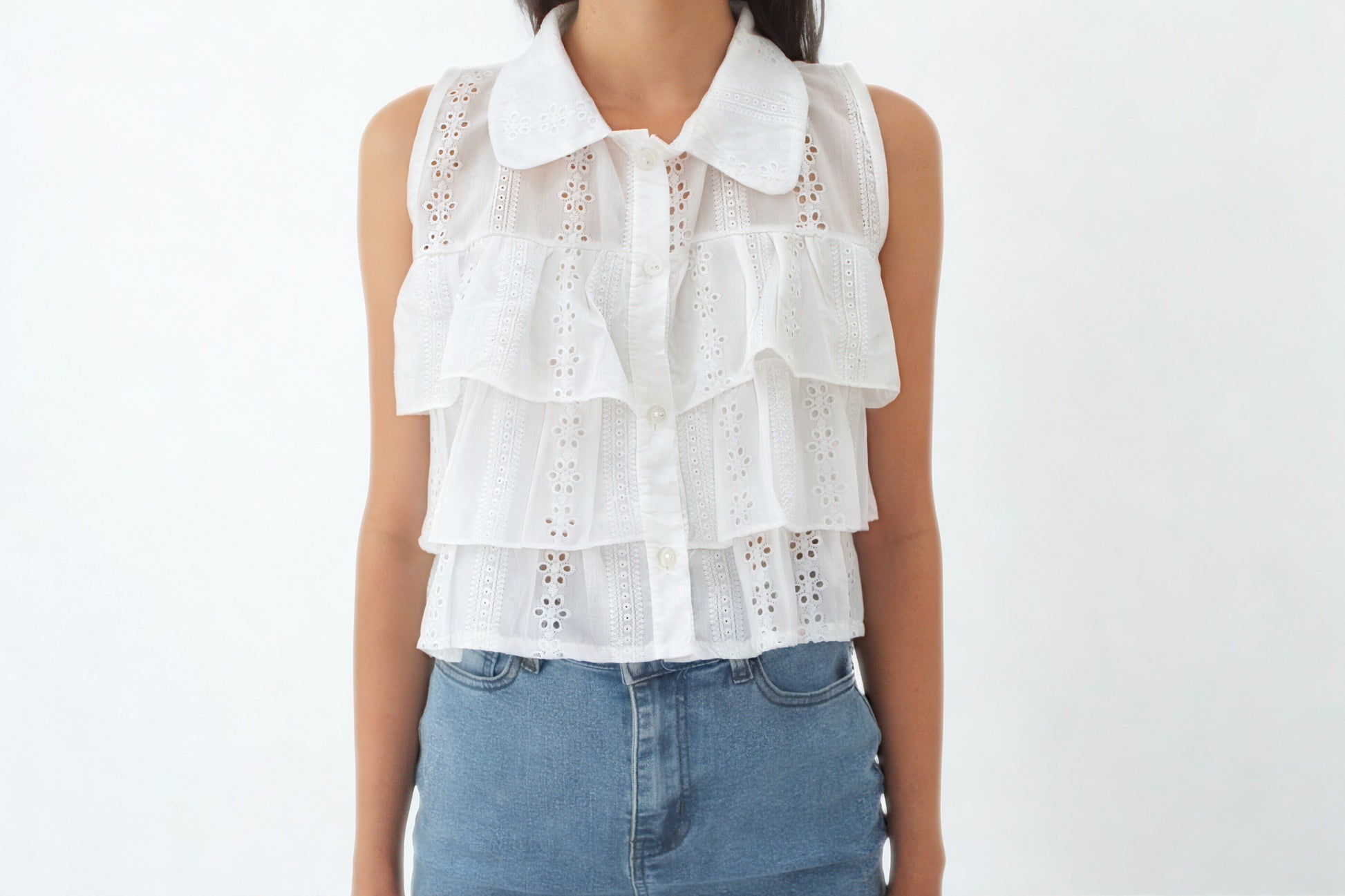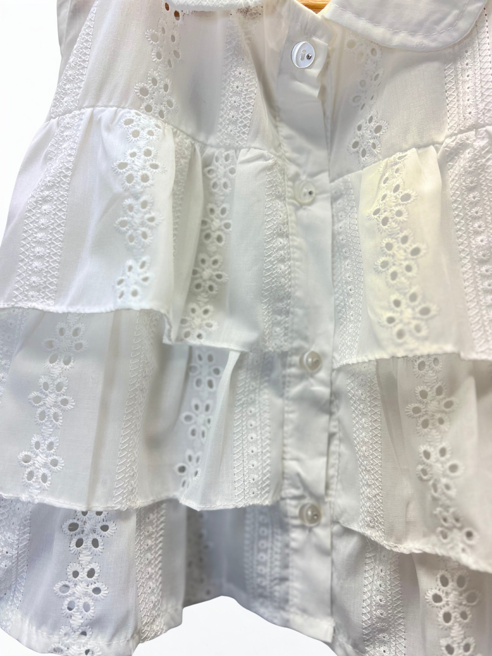 Soft, romantic, and breezy — the Isla Ruffle Eyelet Blouse is made from 100% cotton and features delicate eyelet embroidery with cascading tiered ruffles. Its scalloped detailing and vintage-inspired collar make it an effortless pick for sunny days, picnics, or layering under denim.