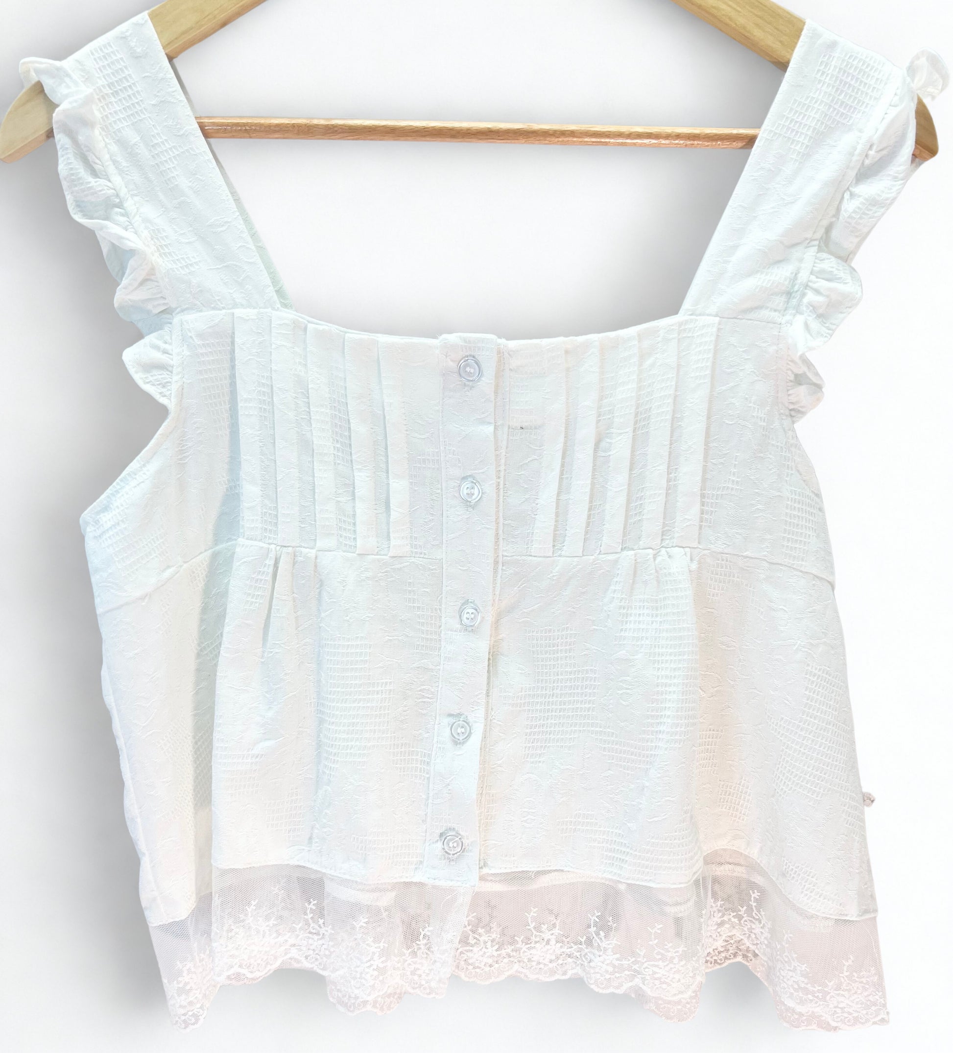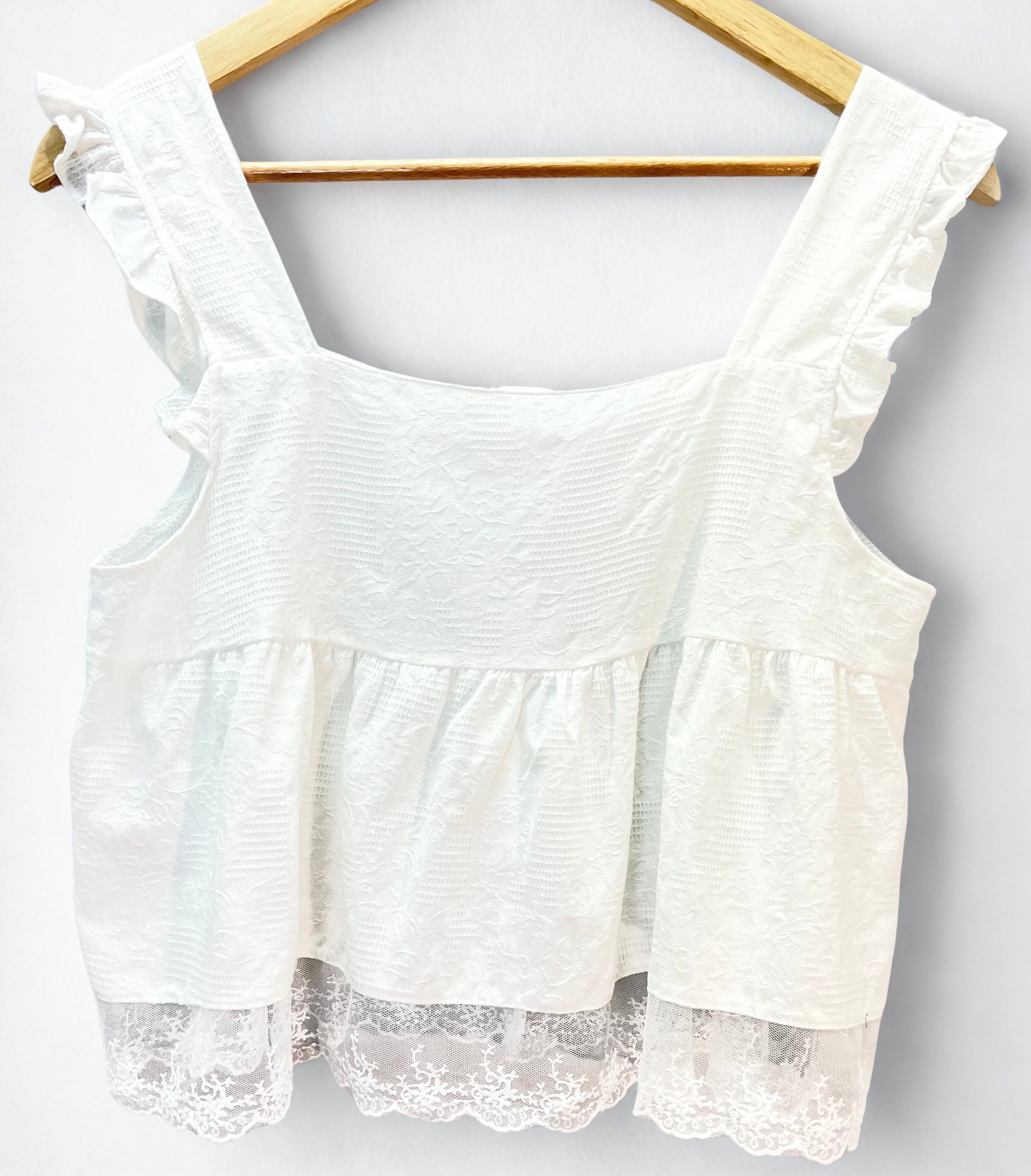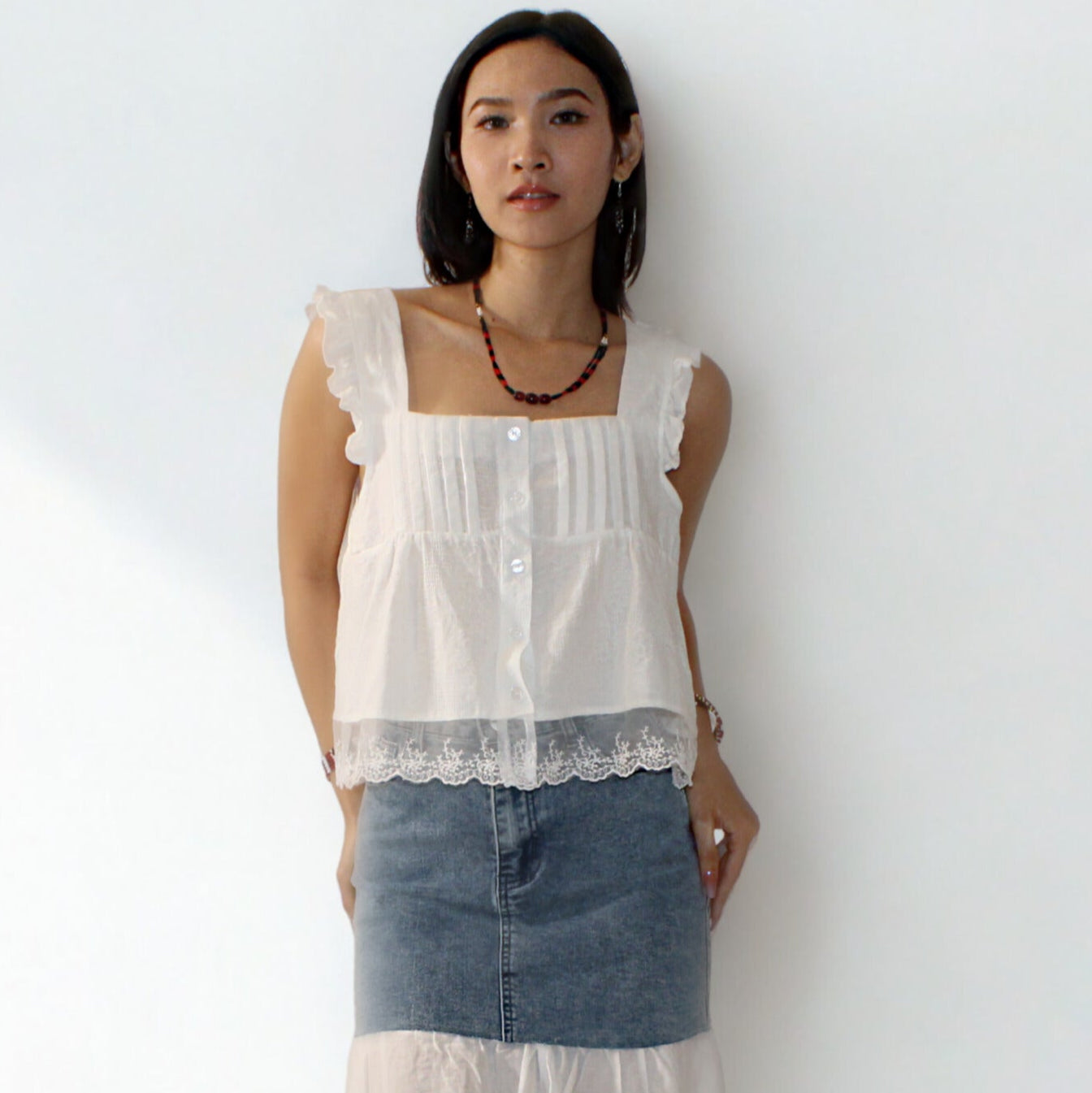 Noira Blanc – White Ruffle Strap Cotton Blouse with Lace Hem