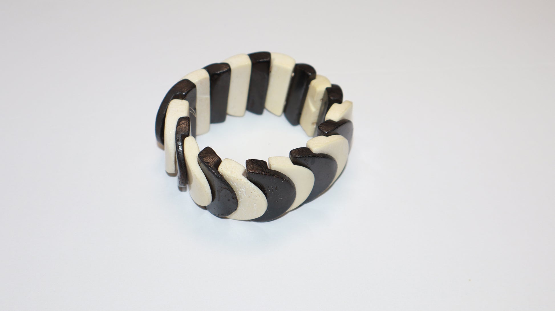 A beautifully handcrafted bracelet made from alternating light and dark natural wood pieces in an elegant curved wave pattern. Lightweight yet bold, this bracelet adds earthy charm to any outfit—perfect for eco-conscious fashion lovers.