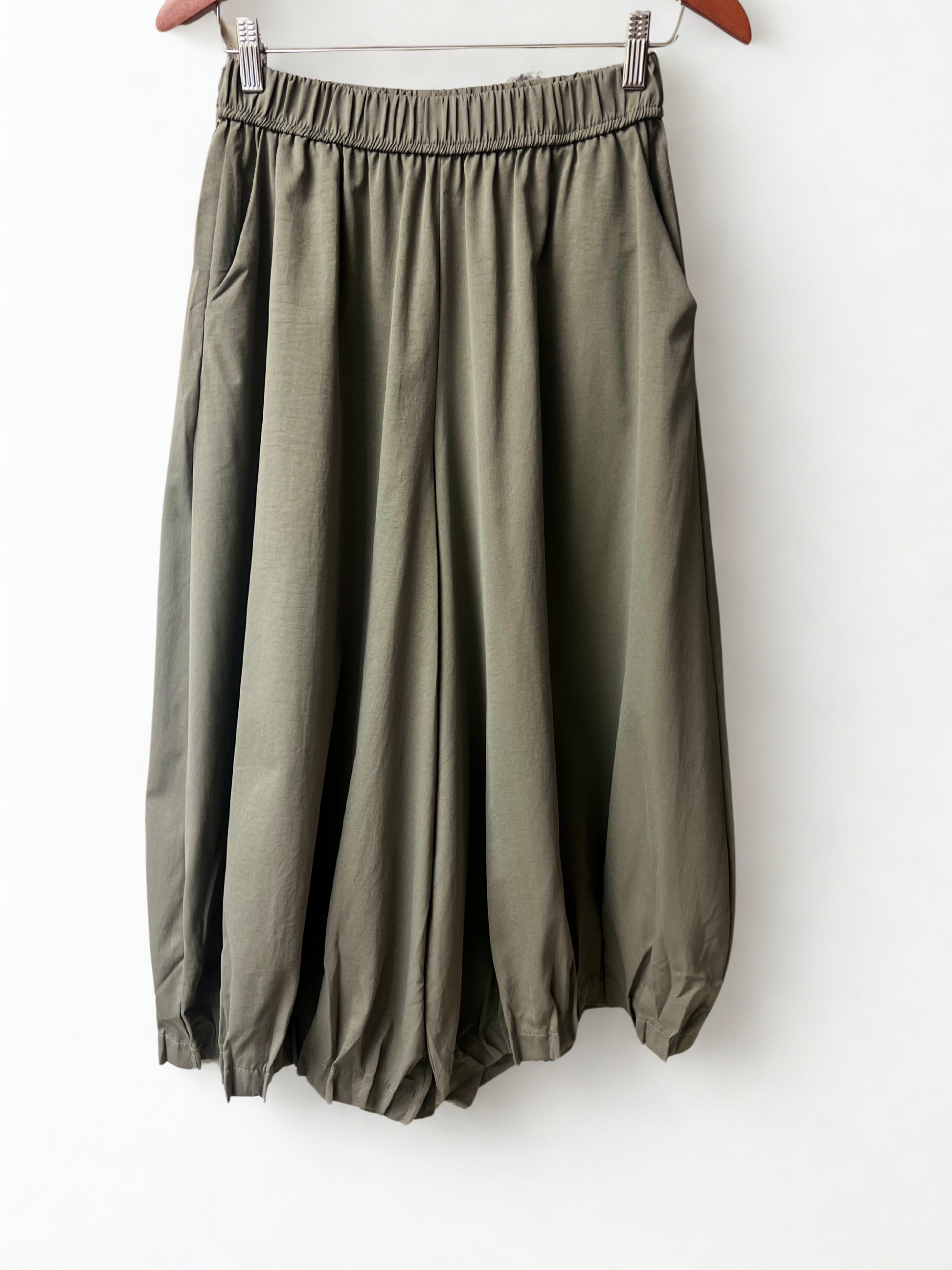 Soft, voluminous, and stylish—these olive green bubble culottes bring playful structure to your everyday look. Featuring an elastic waistband, side pockets, and a unique balloon silhouette, they’re perfect for city strolls, gallery days, or brunch dates.